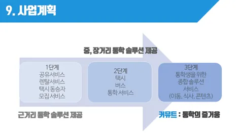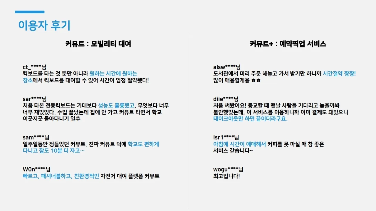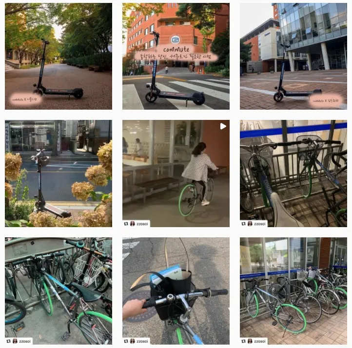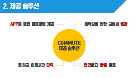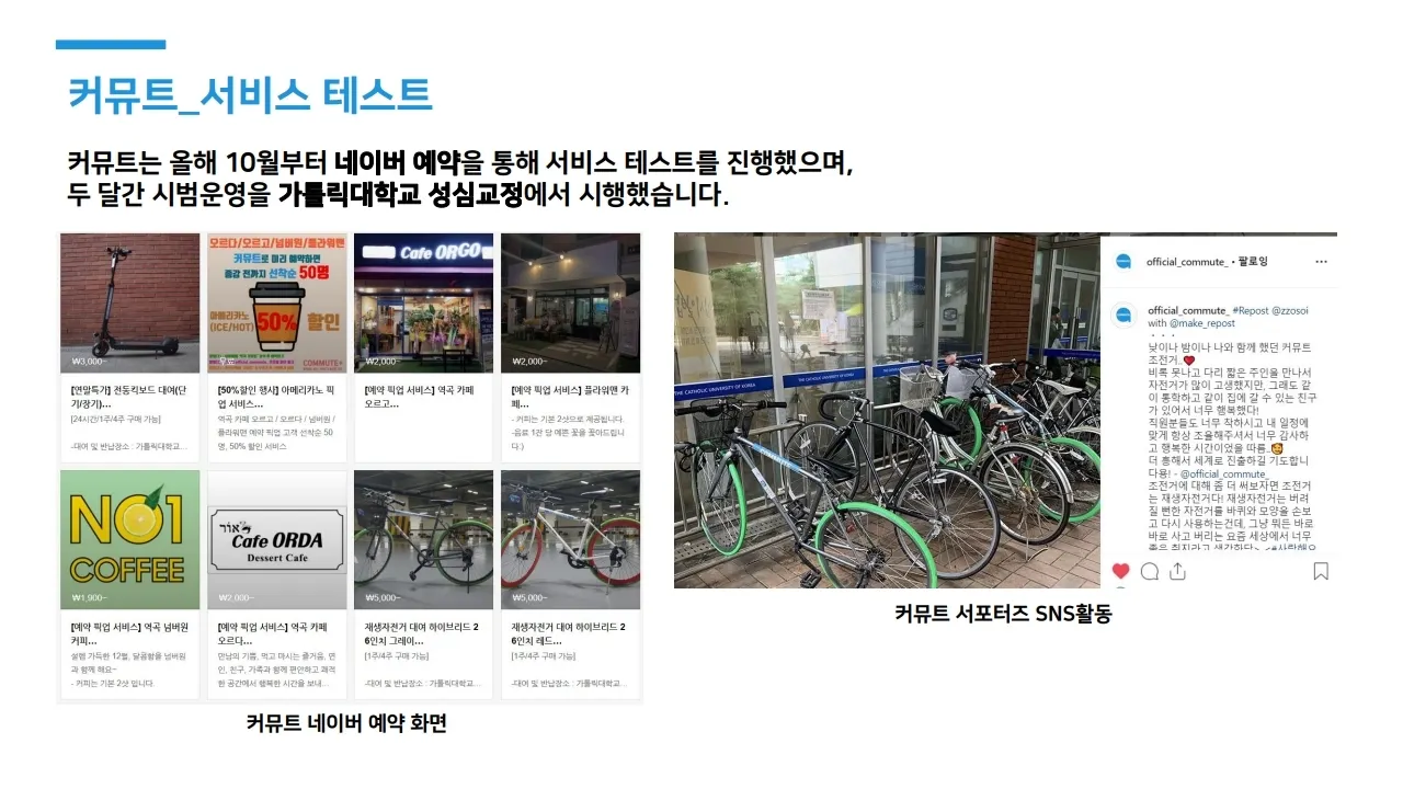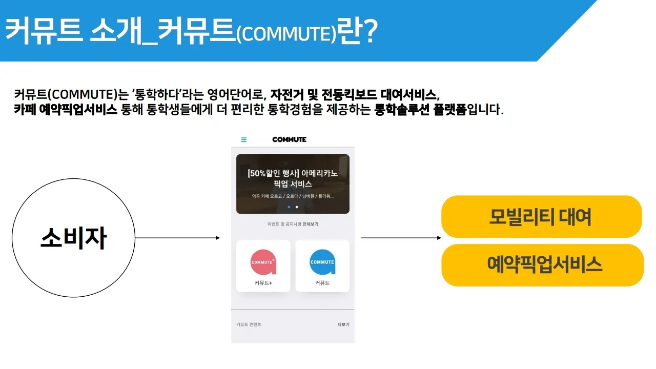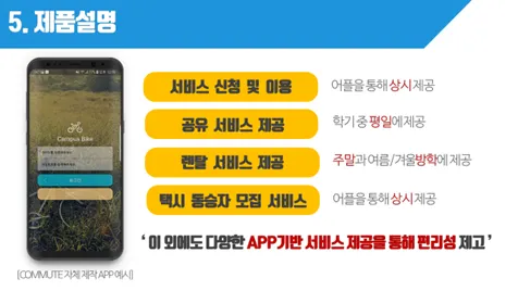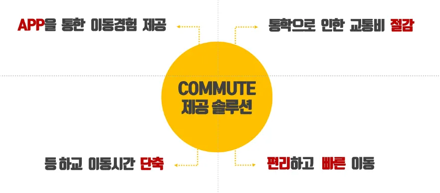 기존에 없던 교통수단을 만들어내면 학생들이 대기나 지형적인 문제에 제한받지 않고 만족스러운 통학을 할 수 있을 것이라는 관점으로 전동킥보드와 자전거를 이용한 모빌리티 대여 서비스 [커뮤트]를 출시하였습니다.
