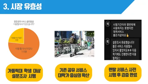 저희 팀은 애매한 거리에 대한 통학의 가장 마지막을 완성하는 프로세스가 비어있다고 생각했습니다. 이에 대한 해결을 하기 위해서는 비어 있는 프로세스를 대체할 이동 수단이 있으면 최상의 통학 경험을 제공할 수 있을 것이라 생각했습니다.