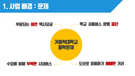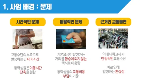 약 도보 15분의 거리를 택시를 타고 이동하기에는 높은 택시요금과 승차거부가 발생하고, 유일한 환승 교통수단인 마을버스는 일반 버스의 크기가 아닌 25인승 버스로 통학시간에 밀집되는 학생들을 수용하기가 어려웠습니다. 따라서 학생들은 15분의 거리를 이동하거나, 다음 버스를 대기했고, 이러한 15분은 학생들로 하여금 강의실에 제시간에 도착하지 못해서 지각으로 이어지는 악순환으로 이어졌습니다.